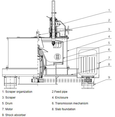 The motor drives the drum to rotate at a medium speed. The feed valve is opened and the material is fed into the drum from the feed pipe. When the feed reaches a predetermined volume, the feeding stops. The drum rises to high-speed rotation. Under the action of centrifugal force, the liquid phase passes through the filter cloth and Drum wall filter holes are discharged. The solid phase is trapped in the rotating drum. After the rotating drum drops to a low speed, the scraper rotates and reciprocates to scrape the solid phase from the drum wall and discharge it from the lower part of the centrifuge.